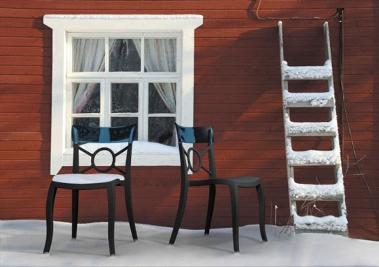 The Opera-S Chair in translucent and solid black makes a moody appearance on a snowy winter's day. Each of the Opera chairs are made to withstand the harsh outdoor elements, making them perfect for any outdoor space.