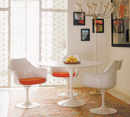 Chair Tulip by Eero Saarinen. Produced by Knoll. In his purist approach to design, Finnish-born Eero Saarinen sought out the essential idea and reduced it to the most effective structural solution. He designed the 1956 Tulip chair in terms of its setting, rather than a particular shape. "In any design problem, one should seek the solution in terms of the next largest thing." he said. "If the problem is a chair, then its solution must be found in the way it relates to the room..." In the Tulip, Saarinen realized his ideal of formal unity: "Every significant piece of furniture has a holistic structure."